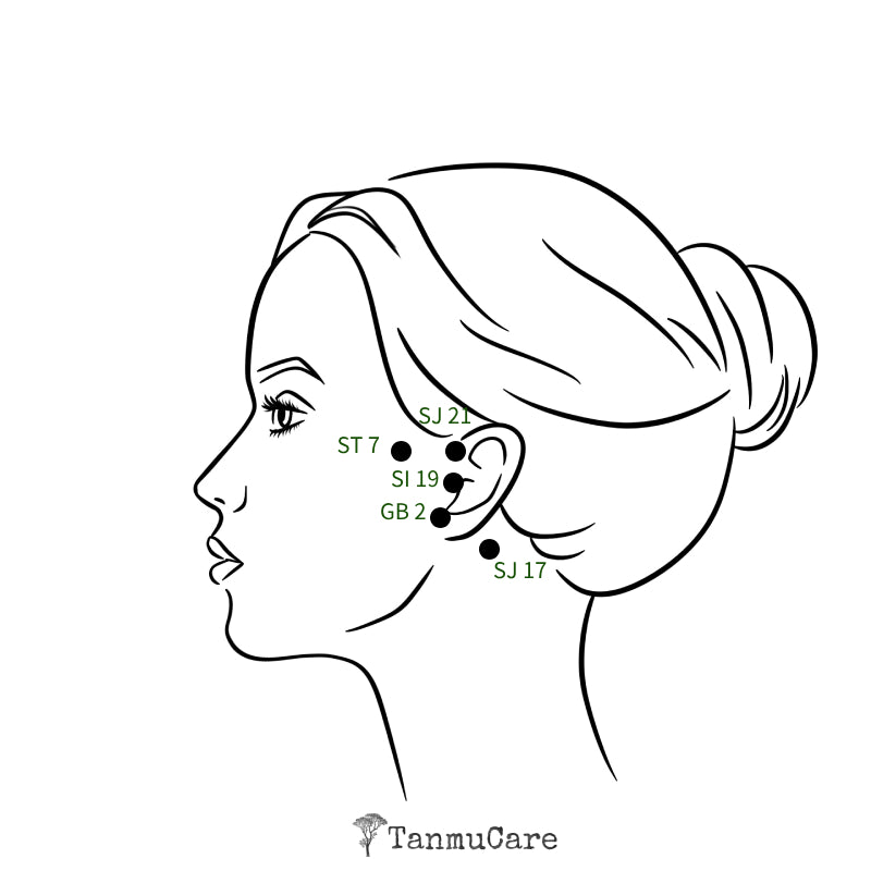 - Acupoint Press: Press 5 key points around the ears (SJ 21, ST 7, SI 19, GB 2, SJ 17), 20-30 times each.