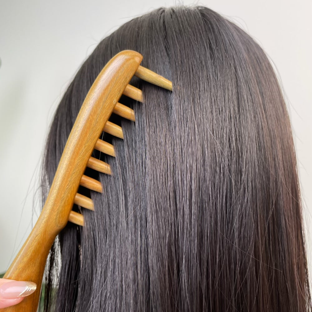 If you use scalp oil in your hair care routine, our green sandalwood comb enhances its effectiveness. Unlike plastic or silicone massagers, which can leave oil floating on the surface, our comb absorbs and evenly distributes the oil with each stroke. This ensures the oil is delivered directly to your scalp, nurturing it without over-oiling your hands or hair. The comb’s natural properties help keep your hair frizz-free and smooth while preventing static. Experience the benefits of properly applied scalp oil with our green sandalwood gua sha comb.