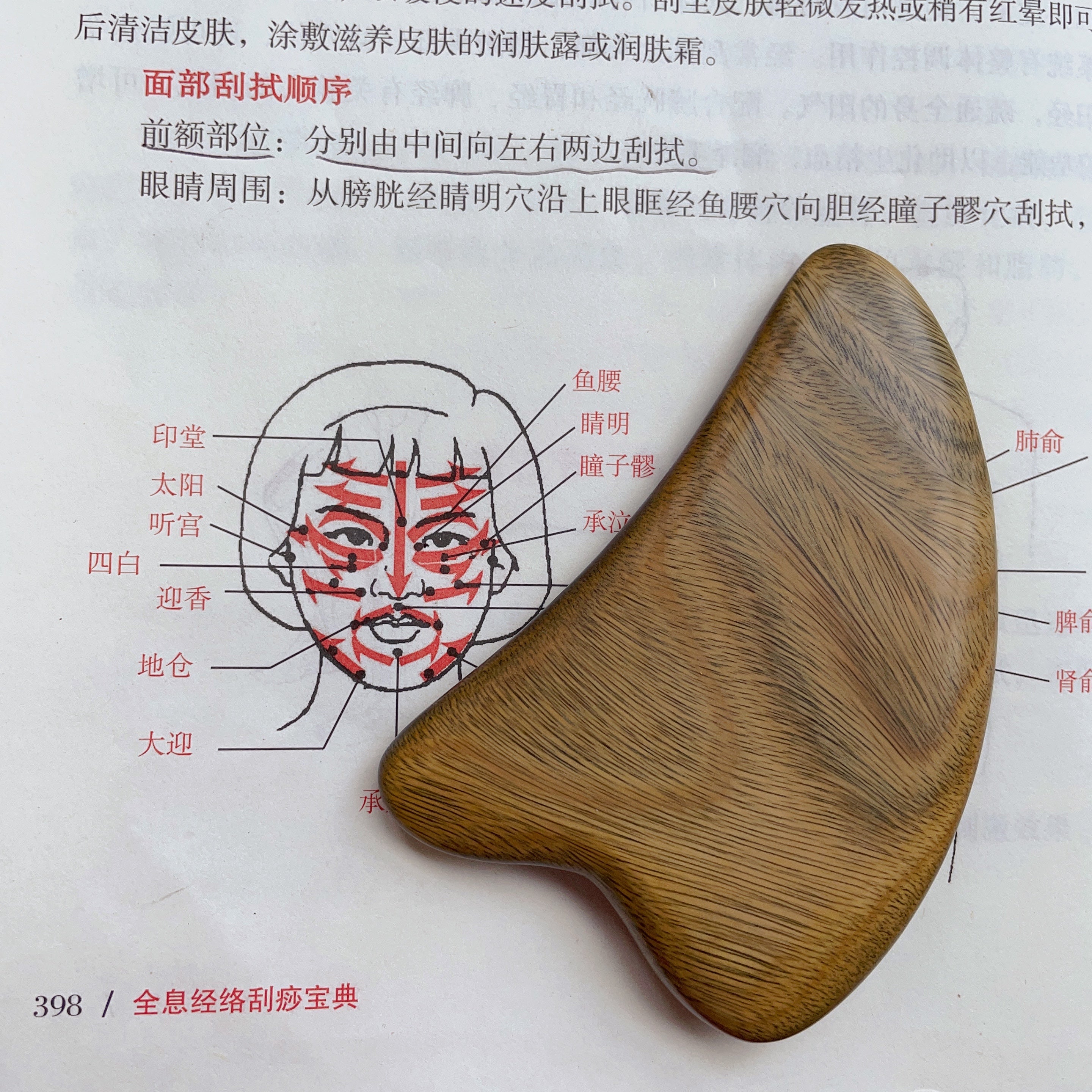 - Gua Sha Technique: Use the sandalwood Gua Sha tool to follow the directions and sequences shown in the image, scraping each line 5-10 times.