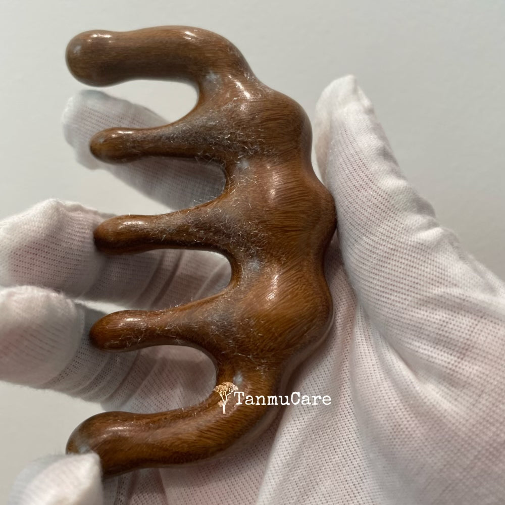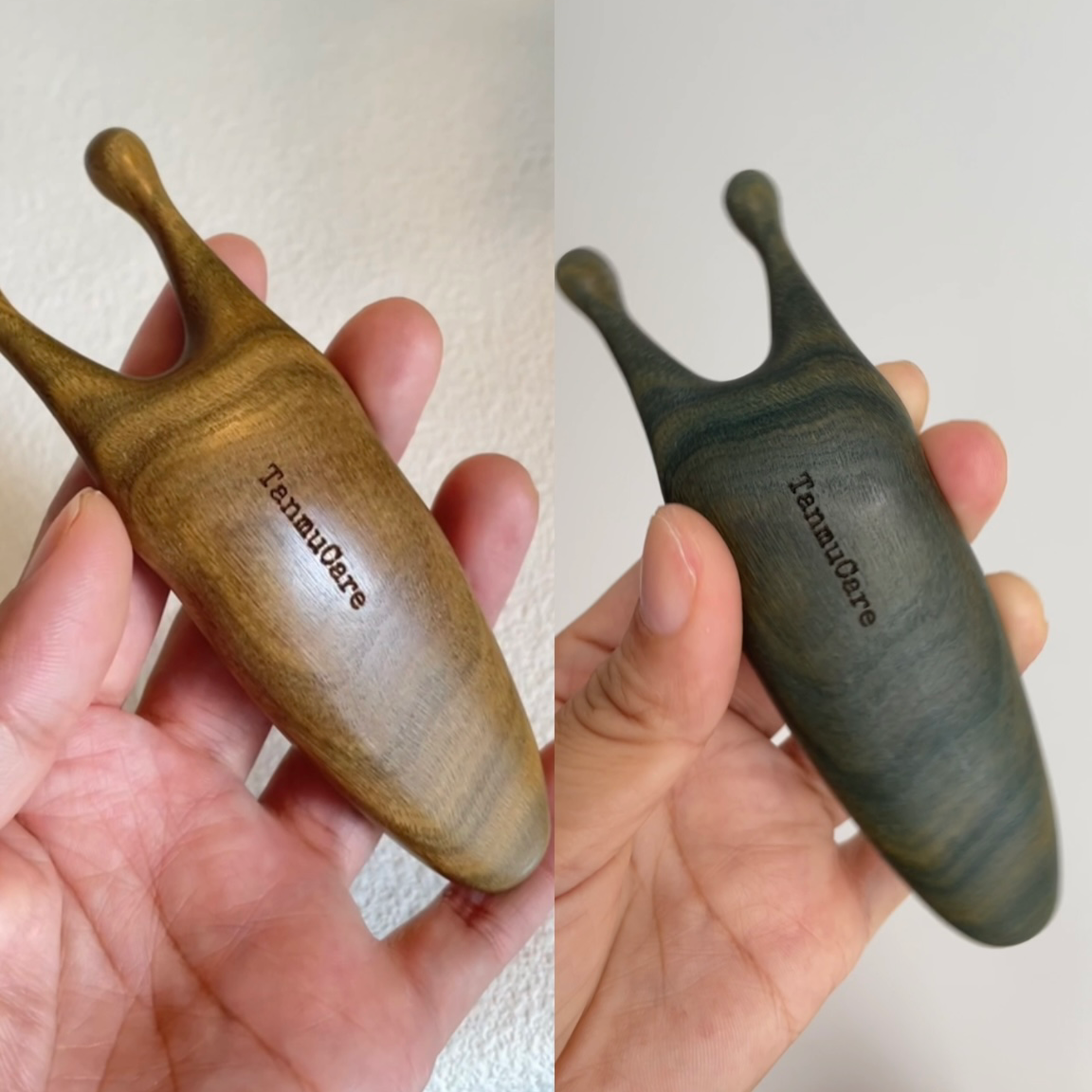 We often get customers asking why the tools' surfaces are so smooth. The reason is that each tool and comb is made of natural green sandalwood, which is rich in oil. With hundreds of hand polishings, we ensure that the tool becomes smooth enough to be gentle on your scalp and skin. The smoothness and shine of the tool come from the oil inside the wood, which enhances its natural beauty. The oil generated from the wood itself on the surface can be wiped away with a gentle wet cloth.